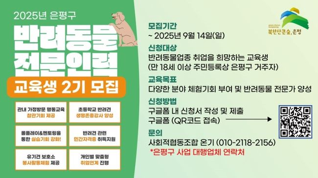 은평구가 반려동물 전문인력을 모집한다.서울 은평구(구청장 김미경)는 급성장 중인 반려동물 산업에 대응하고, 관련 분야 일자리 창출을 위한 ‘반려동물 전문인력 양성 과정’ 제2기 교육생을 오는 9월 14일까지 모집한다고 밝혔다.