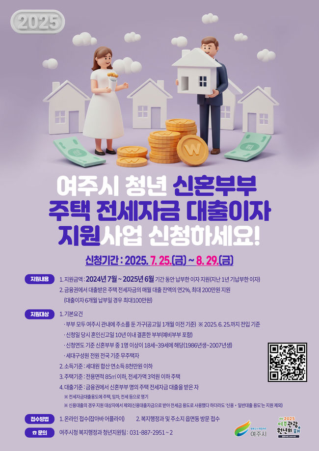 지원 대상은 공고일 기준(7월 25일) 1개월 전부터 여주시에 주민등록이 되어 있고, 혼인신고 후 10년 이내인 무주택 신혼부부다.