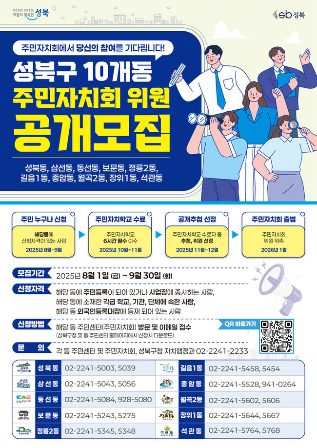 성북구(구청장 이승로)는 8월 1일부터 9월 30일까지 ▲성북동 ▲삼선동 ▲동선동 ▲보문동 ▲정릉2동 ▲길음1동 ▲종암동 ▲월곡2동 ▲장위1동 ▲석관동 등 10개 동 주민자치회를 대상으로 신규위원을 공개 모집한다고 밝혔다. 이번 모집은 12월 31일 자로 임기가 만료되는 주민자치회 위원 교체를 위한 절차로 진행된다.