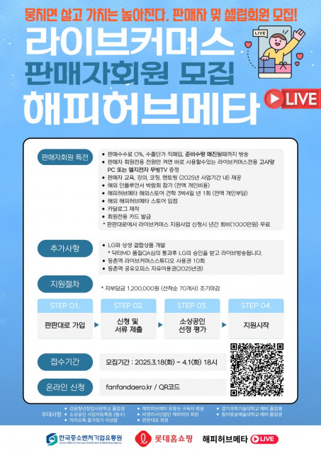 커머스코가 운영하는 소상공인 라이브 커머스 플랫폼 ‘해피허브메타 라이브(https://happyhubmeta.com)’가 셀럽 및 판매자 회원을 모집한다. 모집 기간은 3월 18일부터 4월 1일까지며, 판판대로(https://fanfandaero.kr)를 통해 라이브 커머스 신청 시 연회비 1000만원을 전액 지원한다.