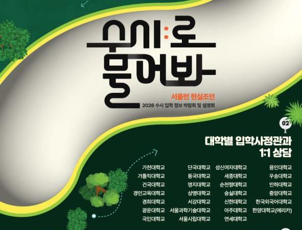 박람회는 `수시:로 물어봐`라는 이름으로 사전 신청을 통해 참여할 수 있다. 서울시는 복잡해지는 입시 전형과 정보 격차 문제를 해소하기 위해 공공 입시 지원 프로그램을 마련했다고 밝혔다.
