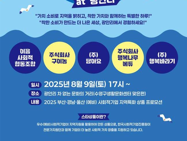 고용노동부와 한국사회적기업진흥원이 올해부터 새로 지원하는 ‘지역특화 스타상품’ 사업의 일환으로, 오는 8월 9일 오후 5시부터 광안리 해변 일대 행사장에서 ㈜담아요, 행복나무에듀, ㈜행복바라기, 이음사회적협동조합, ㈜구이농 등 5개 사회적기업이 특별 전시 부스를 운영한다.
