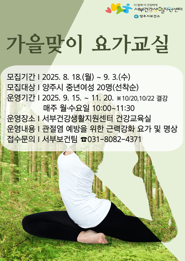 양주시보건소 서부건강생활지원센터가 중년여성을 대상으로 관절염 예방과 신체활동 증진을 위한 ‘가을맞이 요가교실’ 참여자를 선착순 모집한다.