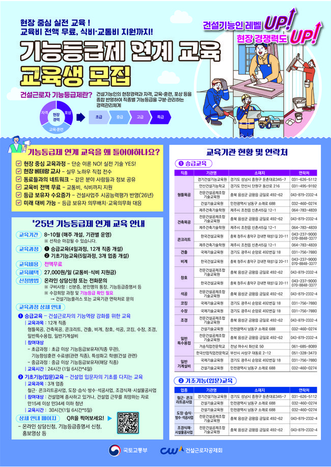 교육은 오는 8월부터 10월 사이 각 교육기관에서 순차적으로 진행된다. 신청은 각 교육기관에 전화로 가능하며, 세부 일정과 방법은 건설기능플러스 안내 페이지(cw.or.kr)에서 확인할 수 있다. 교육비는 전액 무료이고, 식비와 교통비도 지원돼 현장 근로자들의 부담을 크게 낮췄다.