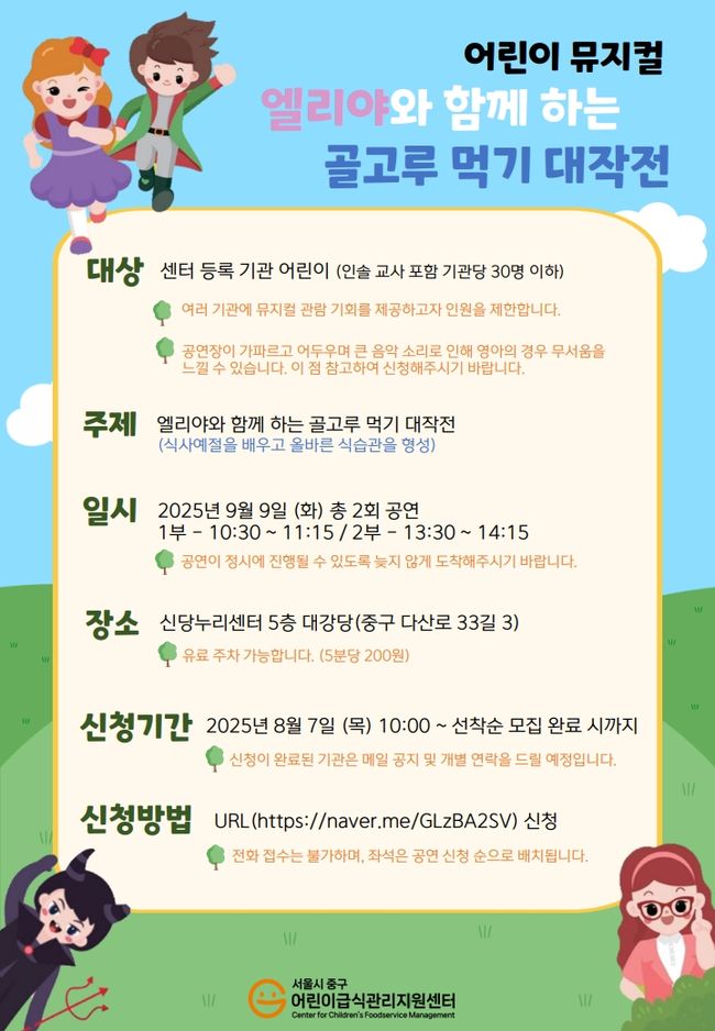 서울 중구(구청장 김길성)와 중구어린이급식관리지원센터가 어린이들에게 올바른 식습관을 알리기 위해 신당누리센터에서 뮤지컬 공연을 무료로 선보인다.
