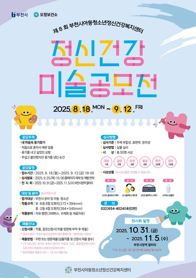 정신건강 미술공모전 홍보 포스터.공모전 주제는 ‘내 마음속 용기찾기’로, 아이들이 일상 속 두려움과 불안을 극복하거나 자신을 다독였던 순간을 그림으로 표현하는 기회를 제공한다. 참여 대상은 부천시에 거주하는 유아와 아동·청소년이며, 작품 분야는 자유 평면으로, 크레파스·수채화 등 재료와 표현 방식에 제한이 없다. 작품 규격은 유아·초등학생은 8절 도화지(272×394mm), 중·고등학생은 4절 도화지(394×545mm)로 구분된다.