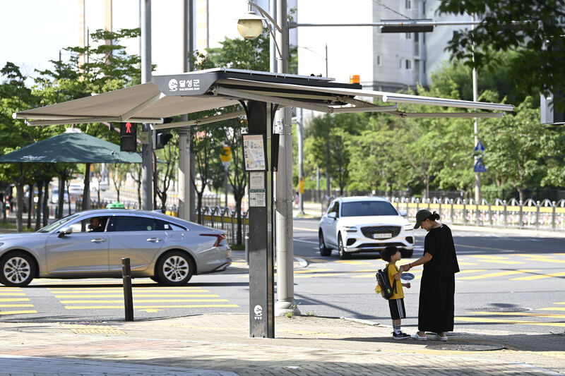한 모자가 횡단보도 앞에서 신호를 기다리며 설치된 스마트 그늘막 아래에서 햇볕을 피하고 있다. 달성군 제공.