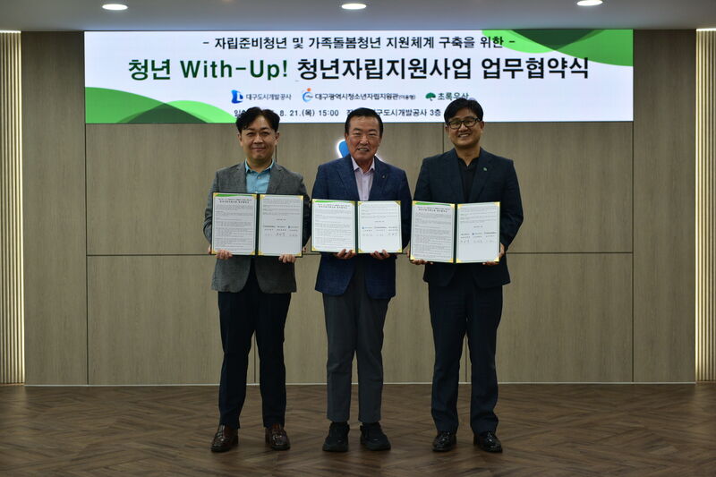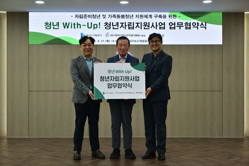 대구도시개발공사(사장 정명섭)는 지난 21일 대구광역시청소년자립지원관, 초록우산 어린이재단 대구지역본부와 함께 자립준비청년과 가족돌봄청년 지원체계 구축을 위한 「청년 With-Up!」 청년자립지원사업 업무협약을 체결했다고 밝혔다.