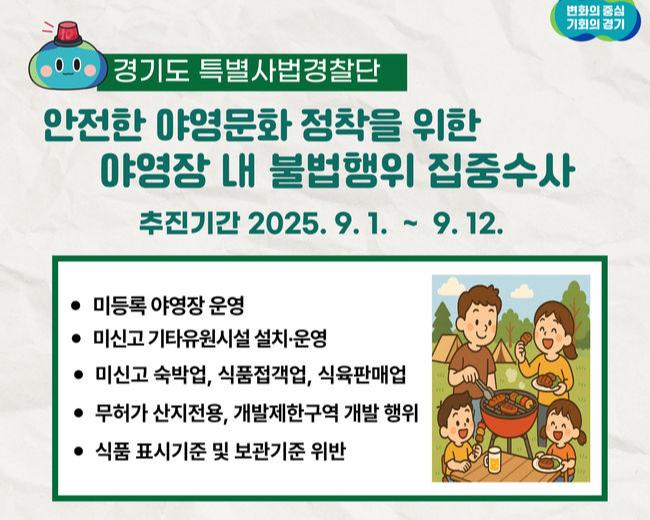 경기도가 9월 1일부터 12일까지 도내 주요 캠핑장 밀집 지역을 대상으로 안전·위생 관련 불법행위를 집중 수사한다.