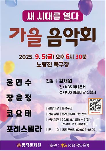 공연 중간에는 경품추첨 이벤트도 진행돼 현장을 찾은 구민들에게 특별한 즐거움을 선사할 예정이다. 관람 사전 신청은 9월 1일부터 2일까지 선착순으로 진행되며, 온라인(QR코드) 또는 전화(동작문화원 ☎02-822-8500)를 통해 1인 2매까지 신청 가능하다. 입장권은 지정석 관람에 필수이며, 훼손이나 분실 시 재발급이 불가하다.