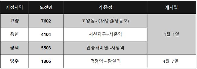 이번에 개통되는 노선은 △고양 7602번(고양동~영등포 CM병원), △용인 4104번(서천지구~서울역), △평택 5503번(안중터미널~사당역), △양주 1306번(덕정역~잠실역)으로, 이 중 양주 노선은 4월 7일 운행을 시작한다.