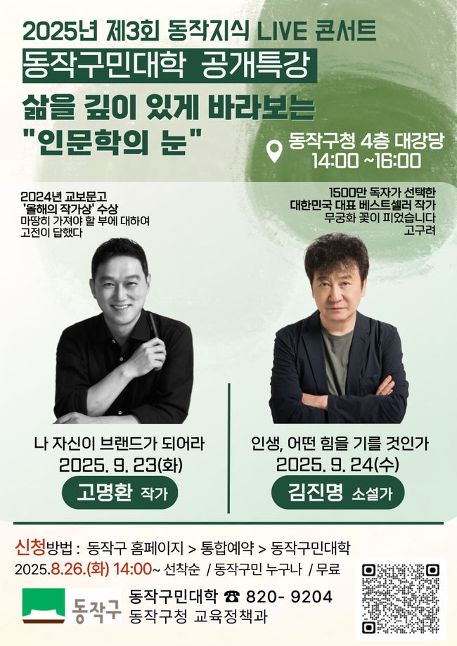 2025년 제3회 동작구민대학 공개특강 홍보 포스터.이번 특강은 동작구형 평생학습 브랜드인 ‘동작구민대학’이 주관하며, 구민들에게 자기 성찰과 삶의 방향을 성찰할 기회를 제공하기 위해 마련됐다. 23일과 24일 회차별로 약 300여 명씩 참여하며, 강연 후 질의응답 시간을 통해 청중과 소통할 예정이다.