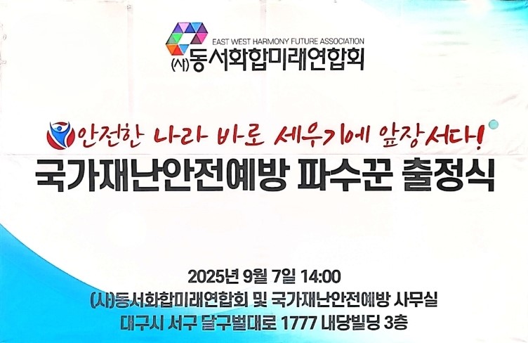 사단법인 동서화합미래연합회 산하 '국가재난안전 예방 국민 파수꾼(국재안파)'는 오는 9월 7일(일) 오후 2시, 대구 서구 달구벌대로 1777 내당빌딩 3층에서 출정식을 열고 공식 활동을 시작한다.