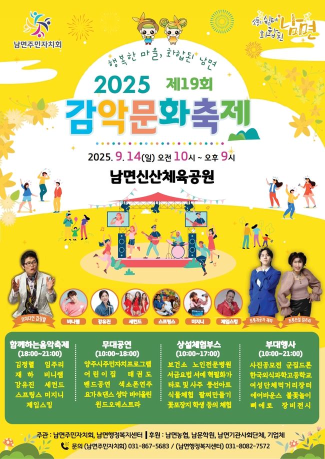 축제는 남면 주민자치회가 주관하고 지역 기관과 단체, 주민들이 자발적으로 참여해 고장의 아름다움과 감악산의 매력을 널리 알리기 위해 준비 중이다. 특히 예년보다 더욱 풍성한 볼거리와 다채로운 체험 프로그램을 마련해 방문객들에게 특별한 즐거움을 선사할 예정이다.
