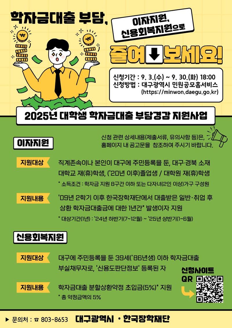 대구광역시는 지역 청년들이 경제적 부담을 덜고 학업과 취업에 전념할 수 있도록 ‘2025년 대학생 학자금대출 부담경감 지원사업’을 추진한다.