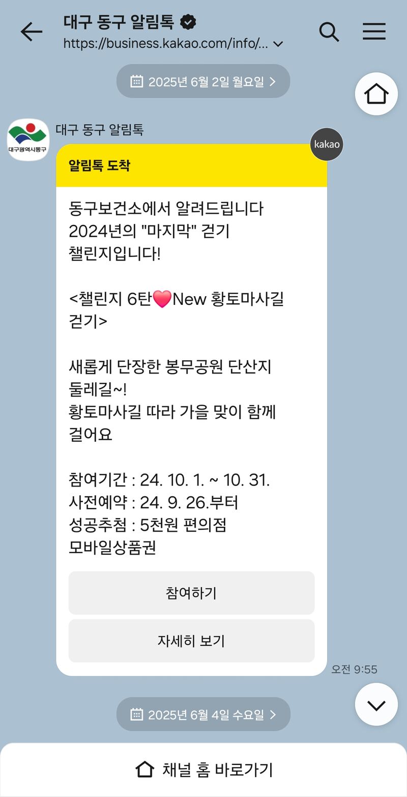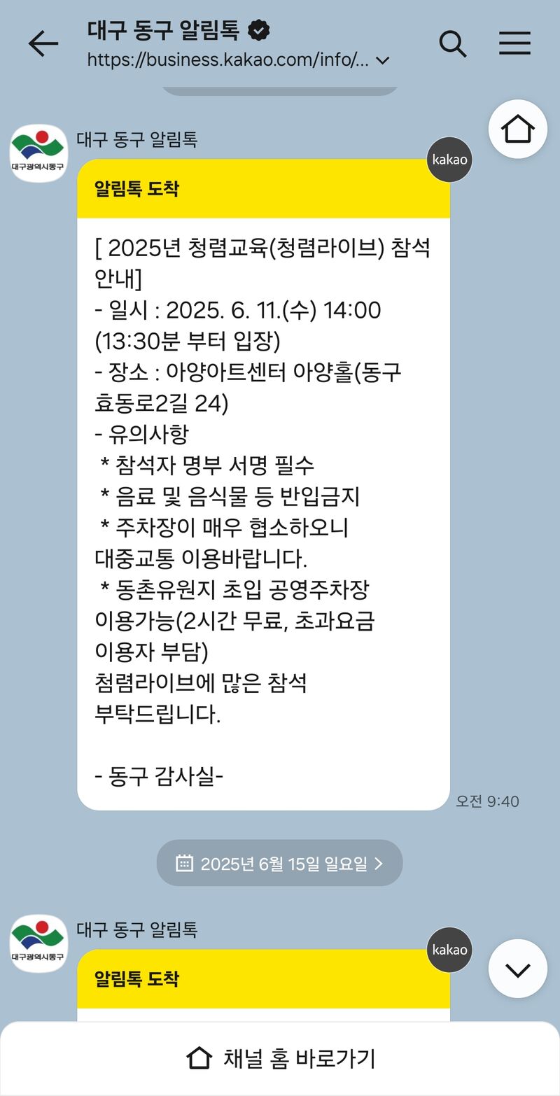 대구 동구청(구청장 윤석준) ‘스마트 통합메시징 시스템’이 대구광역시가 주관하는 2025년 생활밀접 민원제도개선 우수사례에서 장려상을 받았다. 사진은 카카오톡을 활용한 실제 알림사진. 동구 제공.