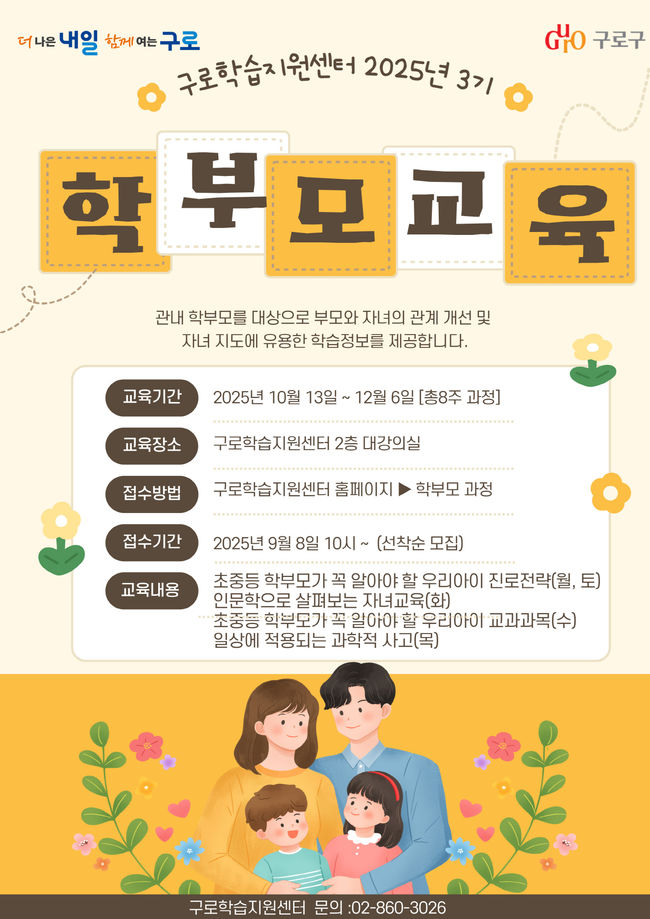 구로구가 관내 학부모 250명을 대상으로 자녀 소통 향상과 지도 역량 강화를 위한 ‘2025년 3기 학부모 프로그램’을 개설했다.