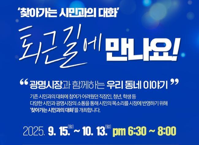 광명시는 오는 9월 15일부터 10월 13일까지 4회에 걸쳐 `2025년 찾아가는 시민과의 대화-퇴근길에 만나요!`를 개최한다고 4일 밝혔다.