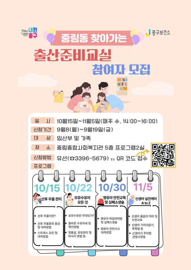 서울 중구(구청장 김길성)가 10월 15일부터 11월 5일까지 매주 수요일 오후 2시, 중림동 중림종합사회복지관 5층에서 `찾아가는 출산준비교실`을 운영한다.