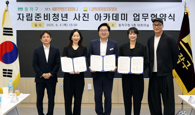박일하 동작구청장(가운데)이 ABF콘텐츠컴퍼니, 니콘이미징모리아와 `자립준비청년 사진 아카데미` 운영을 위한 업무협약을 맺고 기념촬영하고 있다.