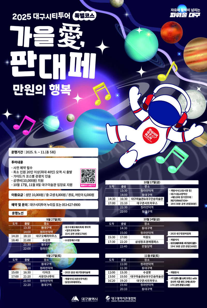 이번 특별노선은 지역의 예술·공연·축제를 하나로 묶은 ‘판대페’와 연계해, 대구의 대표 문화행사를 한눈에 둘러볼 수 있도록 알차게 구성됐다. 가을의 서정과 공연예술의 감동을 함께 즐기기에 안성맞춤이며, 시민과 관광객 모두에게 특별한 문화 체험 기회를 제공한다.