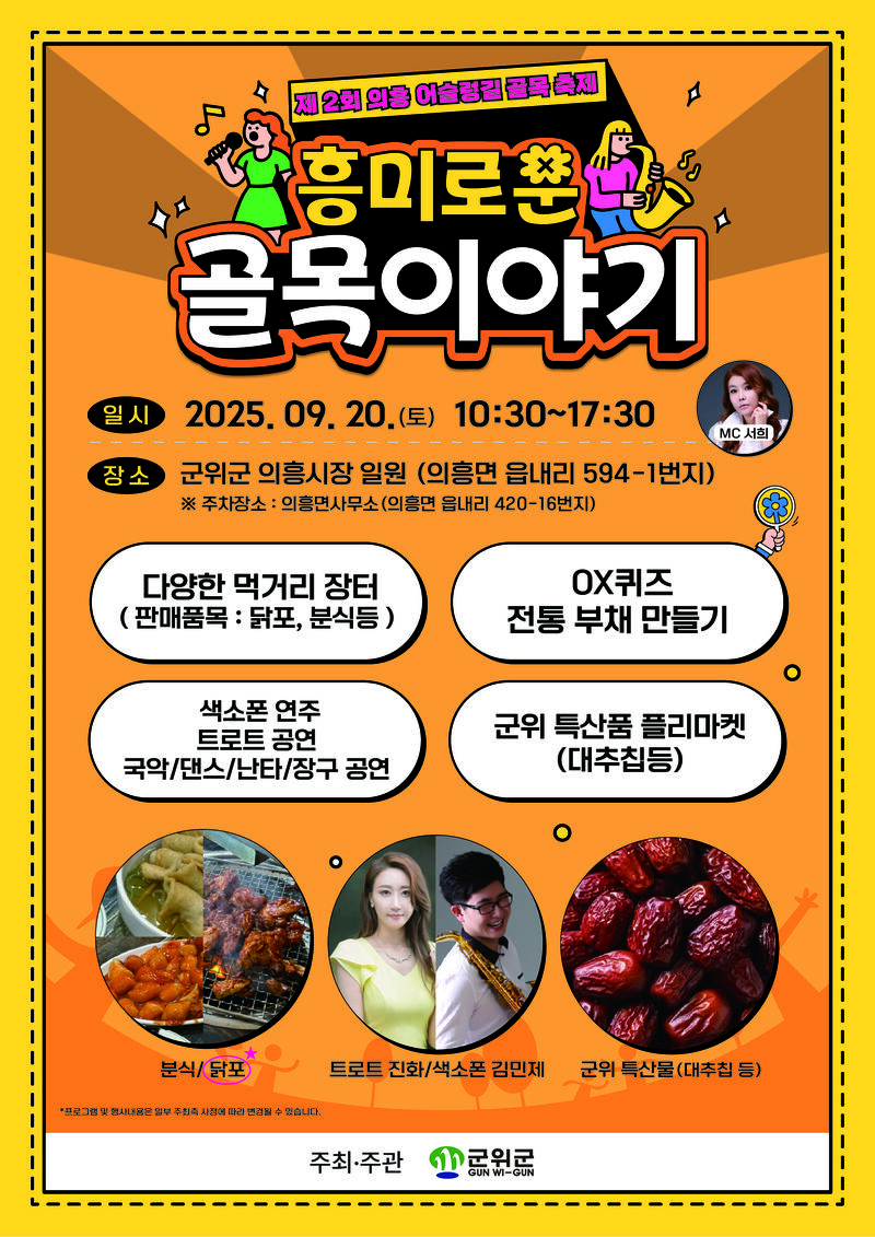 오는 9월 20일(토) 의흥면 의흥시장 일원에서 개최되는 ‘2025년 의흥 어슬렁길 골목축제’는 의흥(義興)만의 흥(興)겨움과 매력적인 맛(味)이 어우러진 축제로, ‘흥(興)미(味)로운 골목이야기’를 부제로 진행된다.