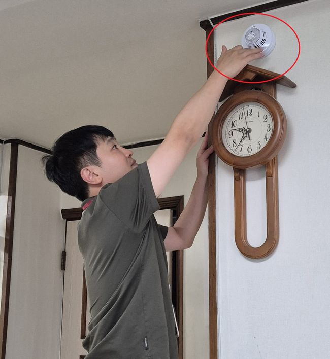 가정용 시각 화재 경보기 설치하는 모습.