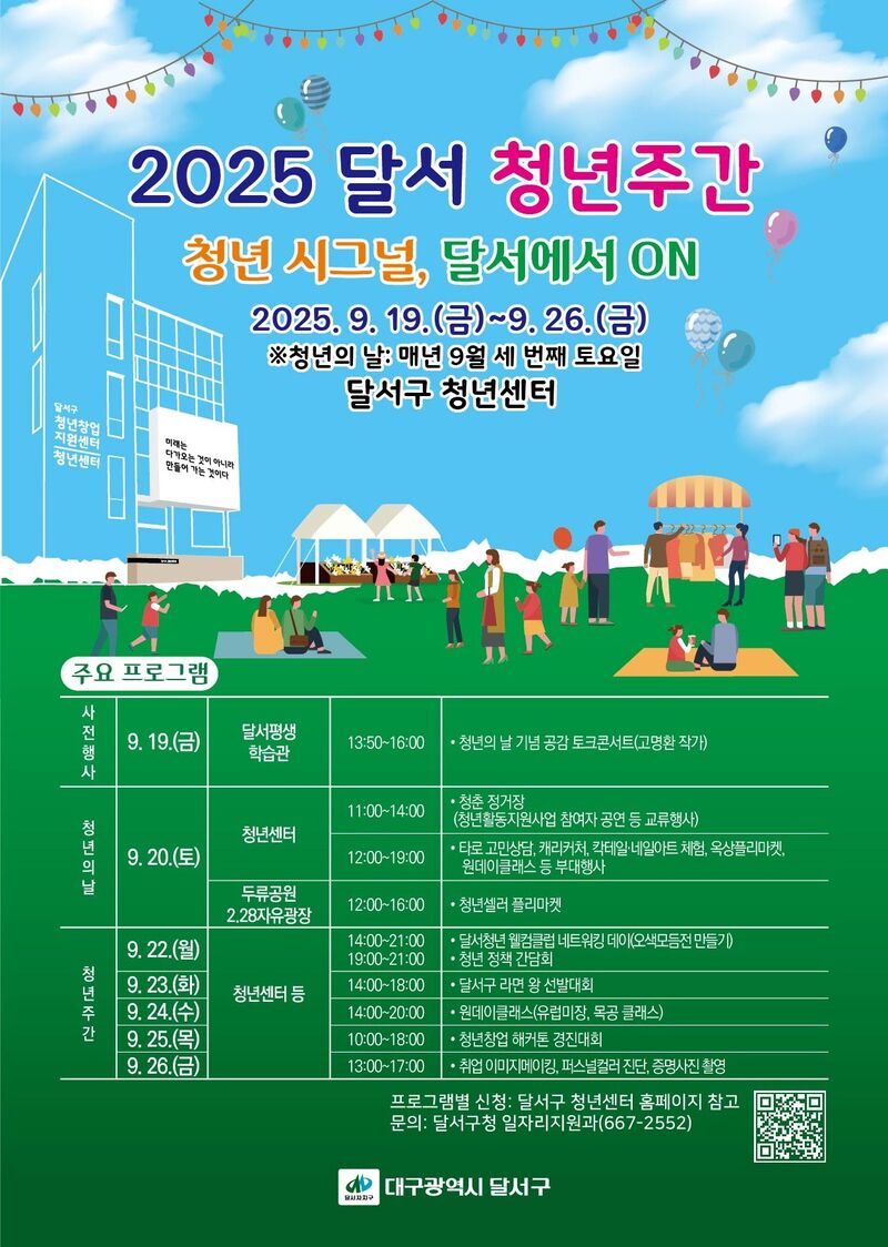 대구 달서구(구청장 이태훈)는 오는 9월 20일 ‘청년의 날’(매년 9월 셋째 토요일)을 기념해 9월 19일부터 26일까지 「2025년 달서 청년주간」을 개최한다고 밝혔다.