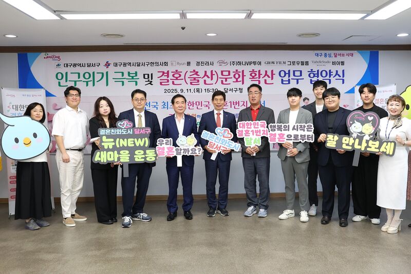 대구 달서구(구청장 이태훈)는 지난 11일 구청에서 대구광역시 달서구한의사회(회장 이태헌)를 비롯한 6개 민간기관·단체와 결혼친화 문화 확산과 저출생 대응을 위한 업무협약을 체결했다.