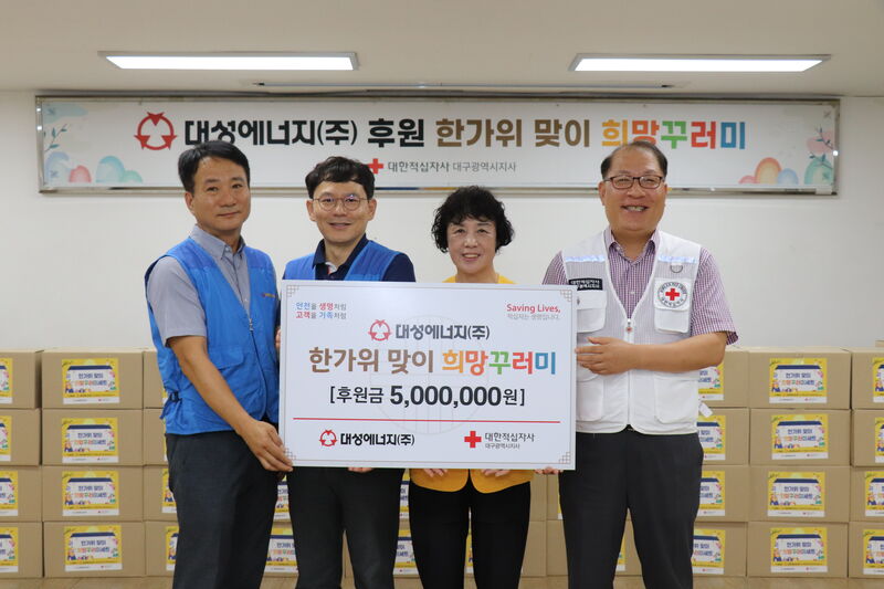 대성에너지(대표이사 박문희)는 16일(화) 대한적십자사 대구지사(회장 배인호) 강당에서 민족의 명절 한가위를 맞아 대구 남구 지역 취약계층을 위한 ‘한가위 맞이 희망꾸러미 나눔 활동’에 참여하고 후원금을 전달했다.