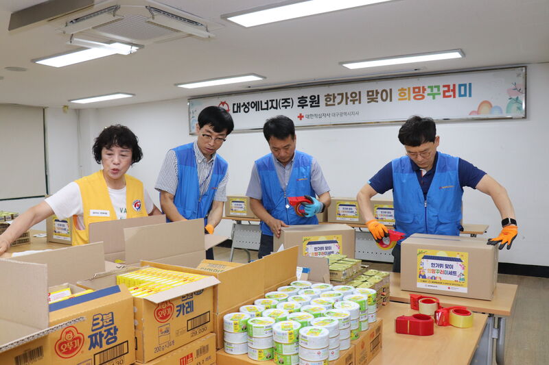 이날 행사에 참여한 대성에너지 직원들은 적십자사봉사회 남구협의회와 함께 추석 명절에 꼭 필요한 식료품, 통조림, 건강기능식품 등 8종의 생필품으로 구성된 희망꾸러미 선물 세트를 포장부터 직접 가정 방문까지 참여해 따뜻한 마음을 전했다.