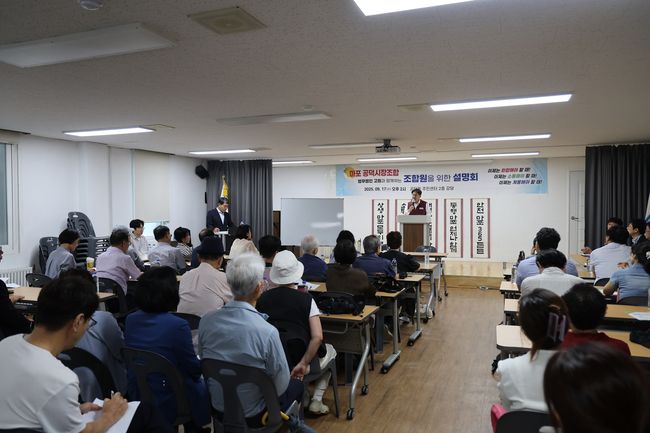 `마포 · 공덕시장 정비사업 조합 주민설명회`에 주민과 조합원들이 참석했다.박 구청장은 9월 17일 오후 2시, 공덕동주민센터 2층 강당에서 열린 마포·공덕시장 정비사업 조합 주민설명회에 참석했다.
