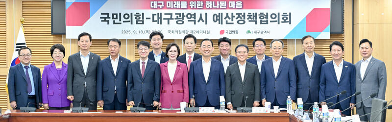 대구광역시와 국민의힘은 9월 18일(목) 국회에서 예산정책협의회를 열고, 내년도 주요 국비사업의 정부예산 최종 반영과 TK신공항 건설· 취수원 이전 등 핵심 현안의 성공적 추진 방안을 논의했다.