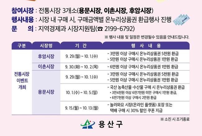 공통적으로 3곳 모두 일정 금액 이상 구매 시 온누리상품권 환급을 실시한다. 용산용문시장과 후암시장에서는 9월 29일∼10월 1일 사이 3만원 이상 구매 시 5천원, 5만원 이상 구매 시 1만원 온누리상품권을 받을 수 있다. 이촌종합시장은 9월 30일∼10월 2일, 6만원 이상 구매 고객 대상 온누리상품권 1만원 환급을 실시한다.