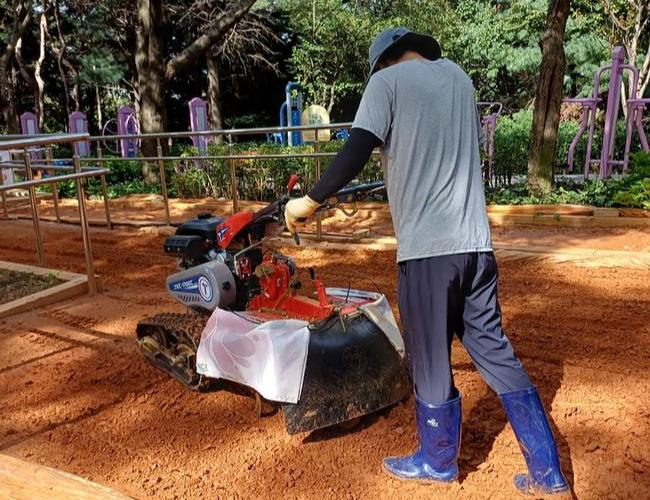 다른 1곳인 구미동 공공공지 내 750m 길이의 황톳길은 로터리 기기를 내년도에 추가 구매한 뒤 흙 뒤집기 작업을 한다.