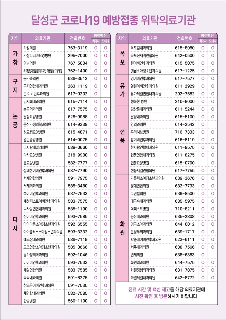 권선영 달성군보건소장은 “코로나19 유행 변이가 매년 달라지기 때문에 고위험군은 최근 변이에 대응할 수 있는 신규 백신으로 접종하는 것이 매우 중요하다”라며, “특히 65세 이상 어르신께서는 코로나19와 인플루엔자 백신을 함께 접종받으시길 바란다”라고 전했다.