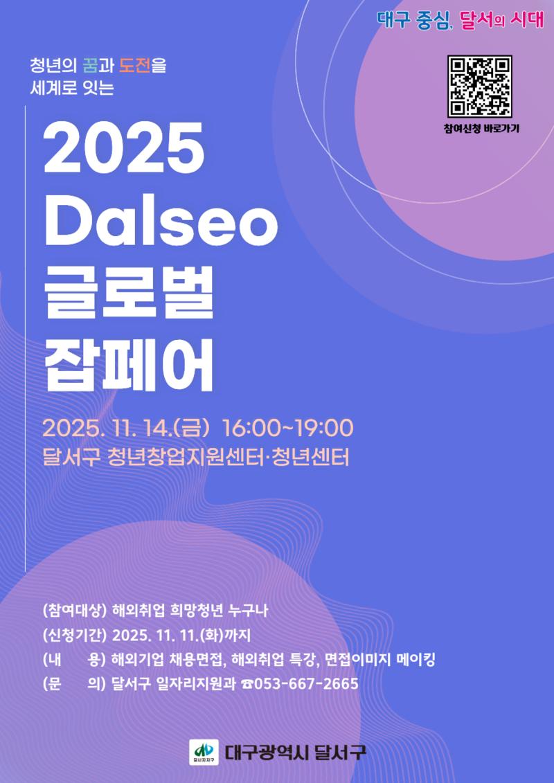 대구 달서구(구청장 이태훈)는 오는 11월 14일, 달서구 청년창업지원센터·청년센터에서 해외취업을 희망하는 청년들을 대상으로 「2025 Dalseo 글로벌 잡페어」를 개최한다.