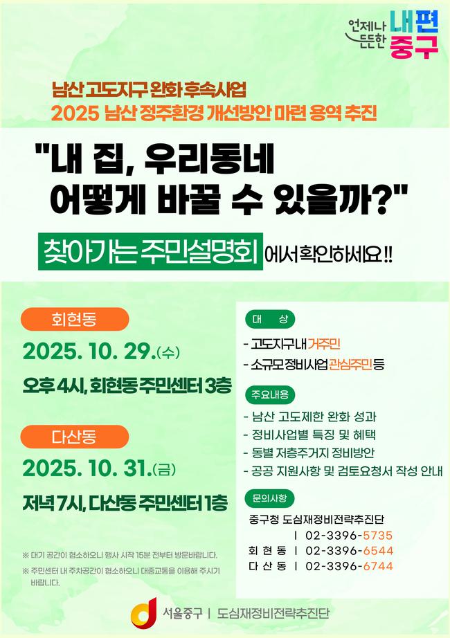 서울 중구가 남산 고도지구 완화에 따른 정비사업과 주거환경 개선방안을 주민과 공유하기 위해 찾아가는 주민설명회를 개최한다.