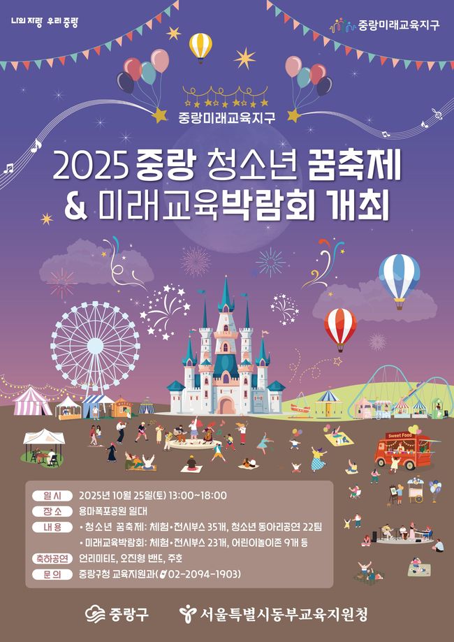 청소년의 꿈과 열정이 한자리에.. 중랑청소년 꿈축제 및 미래교육박람회 개최.서울 중랑구(구청장 류경기)는 오는 10월 25일 오후 1시부터 6시까지 용마폭포공원에서 ‘2025 제7회 중랑 청소년 꿈축제’와 ‘미래교육박람회’를 합동으로 개최한다고 밝혔다.