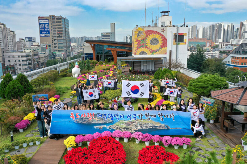 서구청은 10월 24일, 국화로 가득한 서구청 옥상 생태공원에서 ‘독도 사랑 퍼포먼스’를 개최했다. 이날 행사에서 독도 사랑 티셔츠를 입은 직원들은 태극기와 현수막을 흔들며 한마음으로 독도를 사랑하는 마음과 수호 의지를 표현했다.