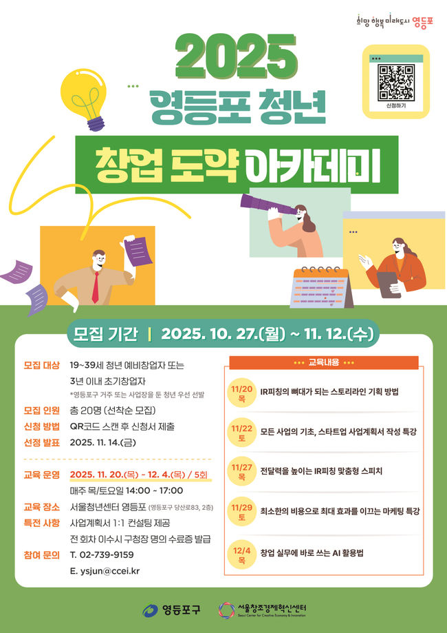 청년 창업 도약 아카데미 홍보 포스터.영등포구(구청장 최호권)는 청년 창업자의 안정적인 사업 정착과 경영 자립을 돕기 위해 ‘청년 창업 도약 아카데미’ 참여자를 오는 11월 12일까지 모집한다고 밝혔다.