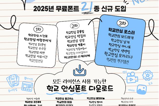 교육부(장관 최교진)와 한국교육학술정보원(원장 정제영)은 올해 신규로 보급하는 학교 안심폰트 21서체 21종을 제공한다고 밝혔다. 학교 안심폰트는 교육 현장에서 저작권 분쟁이나 사용 제한 없이 자유롭게 사용할 수 있도록 제작된 글꼴로, 이용 목적이나 대상에 제약이 없다.