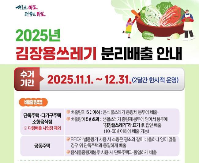 마포구(구청장 박강수)는 본격적인 김장철을 맞아 11월 1일부터 12월 31일까지 한시적으로 `김장용 쓰레기 특별 수거 기간`을 운영한다.