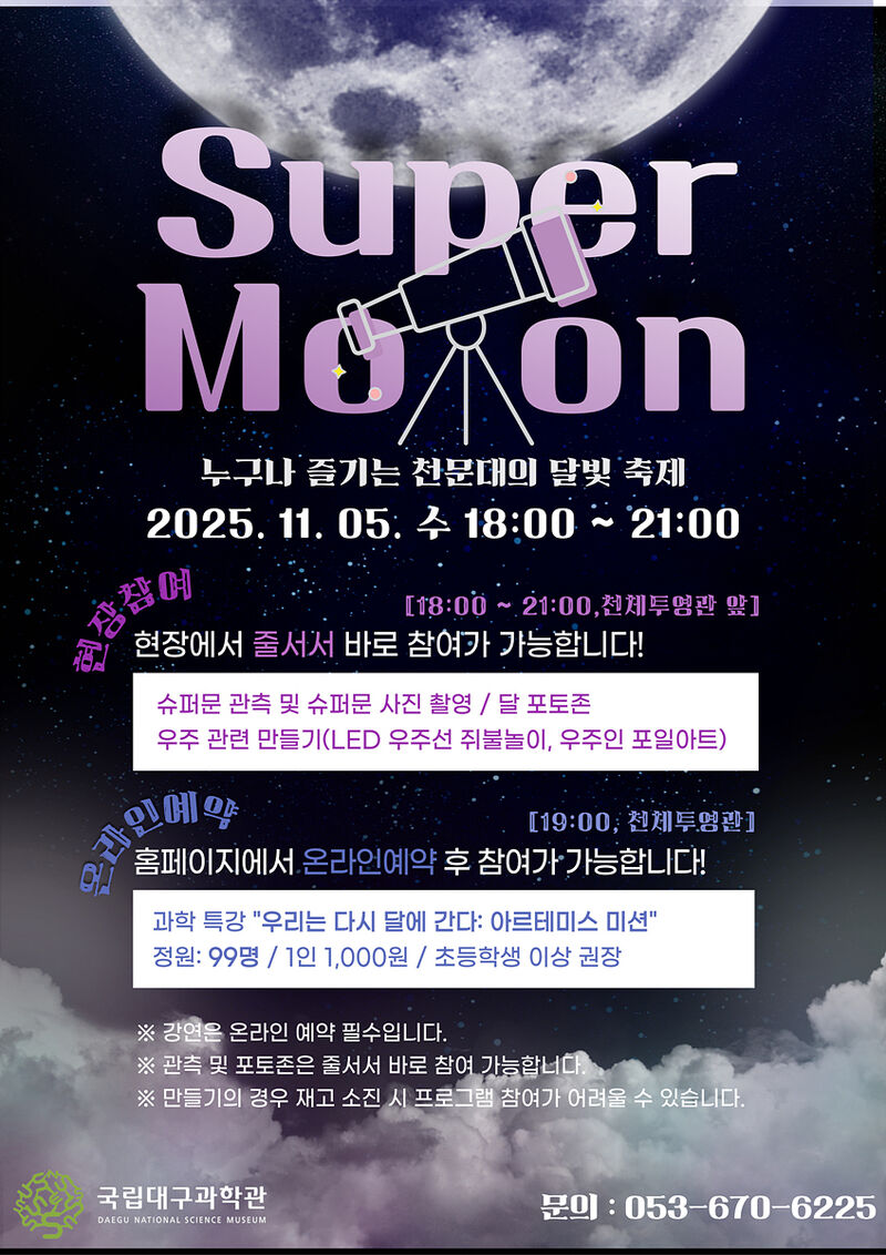 올해의 슈퍼문은 11월 5일에 관측할 수 있으며, 2025년 관측되는 달의 크기 중에 가장 크고 밝게 보이는 달이다. 이를 기념하여 국립대구과학관에서는 11월 5일 슈퍼문 관측행사를 개최한다.