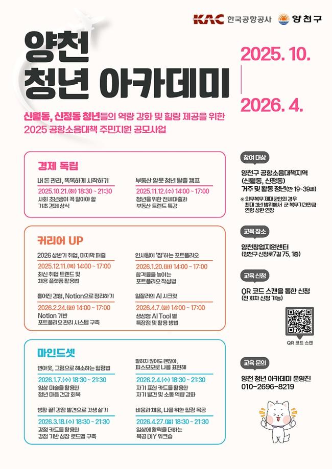 프로그램은 월 1∼2회씩 총 10회 과정으로, 신정3동 양천창업지원센터 1층에서 내년 4월까지 진행된다. 회차별 20명 내외의 청년이 참여 가능하며, 신월·신정 지역에 거주하거나 활동 중인 19∼39세 청년이 대상이다. 의무복무 제대군인의 경우 최대 3년까지 연령 상한을 연장해 참여 기회를 확대했다.