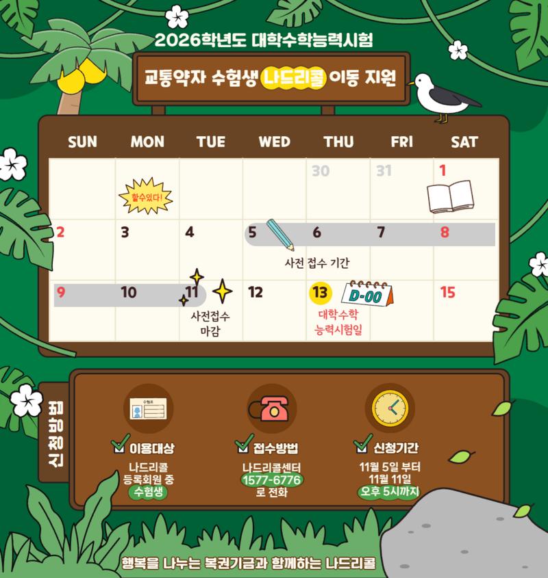 나드리콜 회원 수험생은 11월 11일(화) 17시까지 24시간 운영되는 나드리콜센터(☎1577-6776)를 통해 사전 신청하면, 시험 입실·퇴실 시간에 맞춰 차량을 무료로 이용할 수 있다.