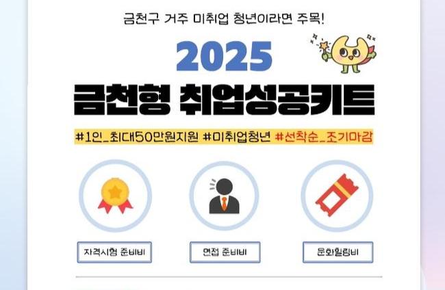 금천구(구청장 유성훈)는 미취업·미창업 청년의 구직활동을 지원하기 위해 `2025 금천형 취업성공키트` 신청자를 오는 11월 30일까지 모집한다고 밝혔다.