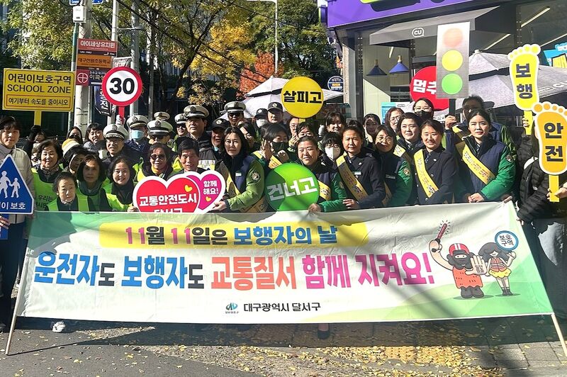 대구 달서구(구청장 이태훈)는 ‘2025년 보행자의 날(11월 11일)’을 맞아 11월 10일 성서노인종합복지관 앞 삼거리(노인보호구역)에서 ‘보행안전 릴레이 캠페인(신호등 퍼포먼스)’을 개최했다.