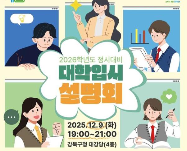 서울 강북구(구청장 이순희)는 오는 12월 9일(화)과 13일(토) 강북구청 대강당에서 `2026학년도 정시 대비 대학입시 설명회`와 `1:1 진로 진학 상담`을 연이어 개최한다고 밝혔다.
