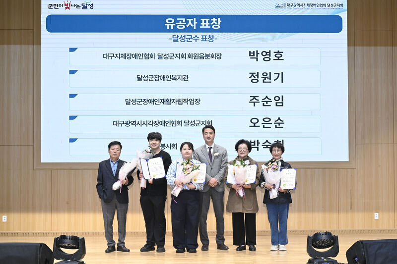 이날 유공자 표창은 장애인의 재활 의욕 고취와 사회참여 확대, 자립의지 제고 등 장애인 복지 향상에 기여한 공로자에게 수여됐다. 군수 표창에는 달성군장애인복지관 정원기 사회복지사 등 5명이, 국회의원 표창에는 지체장애인협회 박동진 씨 등 3명이, 군의장 표창에는 광법봉사회 김은주 씨 외 2명이 선정되는 등 총 20명이 수상의 영예를 안았다.